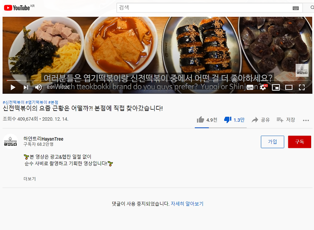 12월7일 '하얀트리'는 자신의 유튜브 채널에 음식 재사용하는 간장게장 무한리필 식당 촬영 거부하겠습니다라는 제목으로 영상을 올렸다.